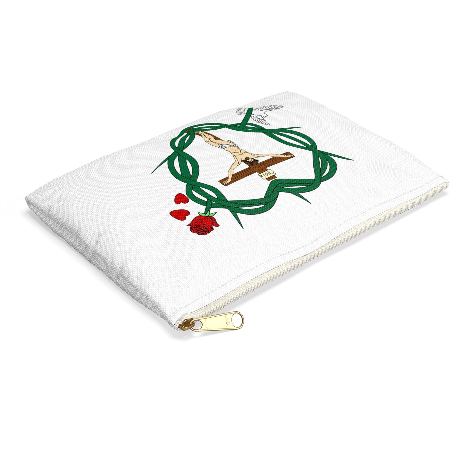 Carry your personal items in this accessory pouch and remember you are loved and protected in the shield of Christ.