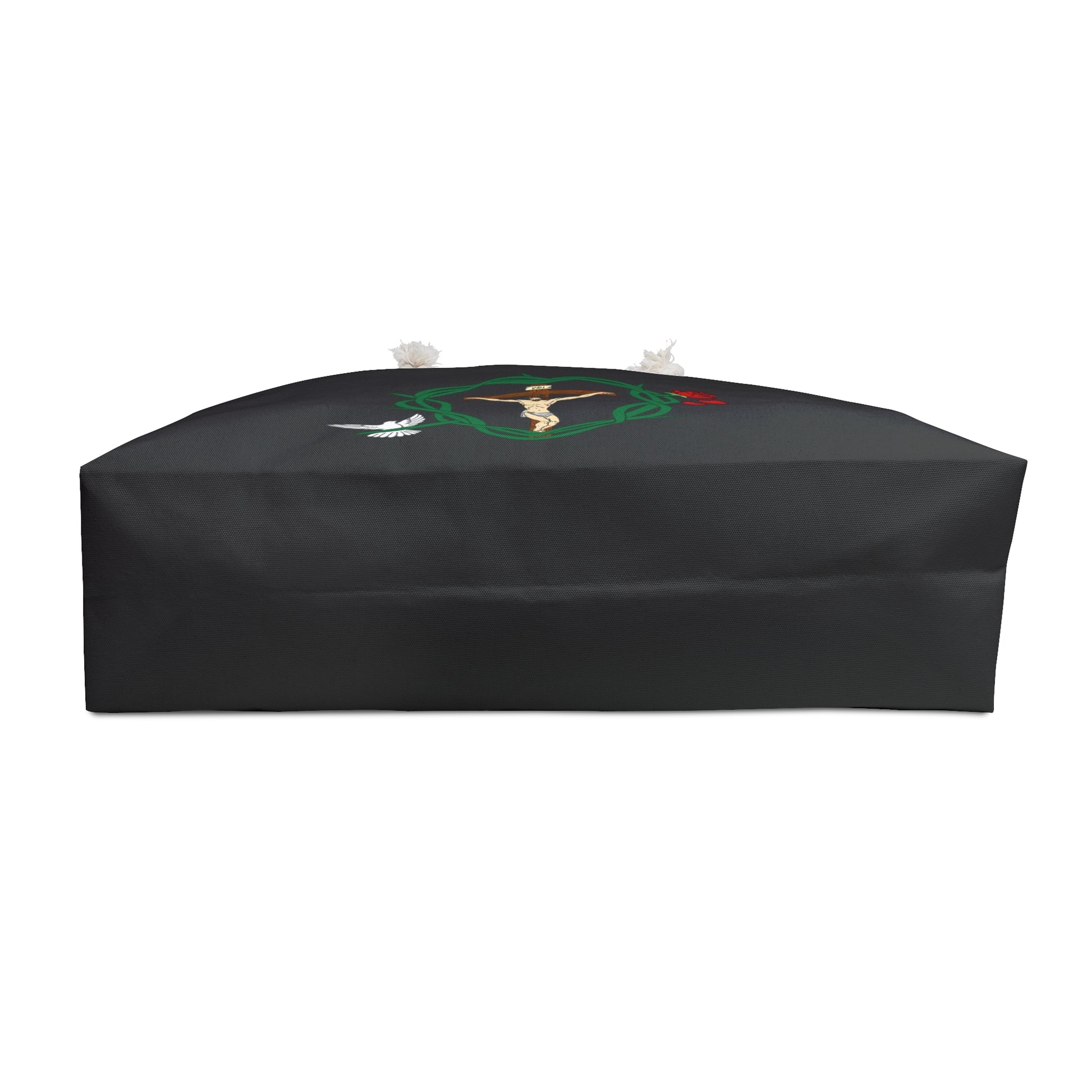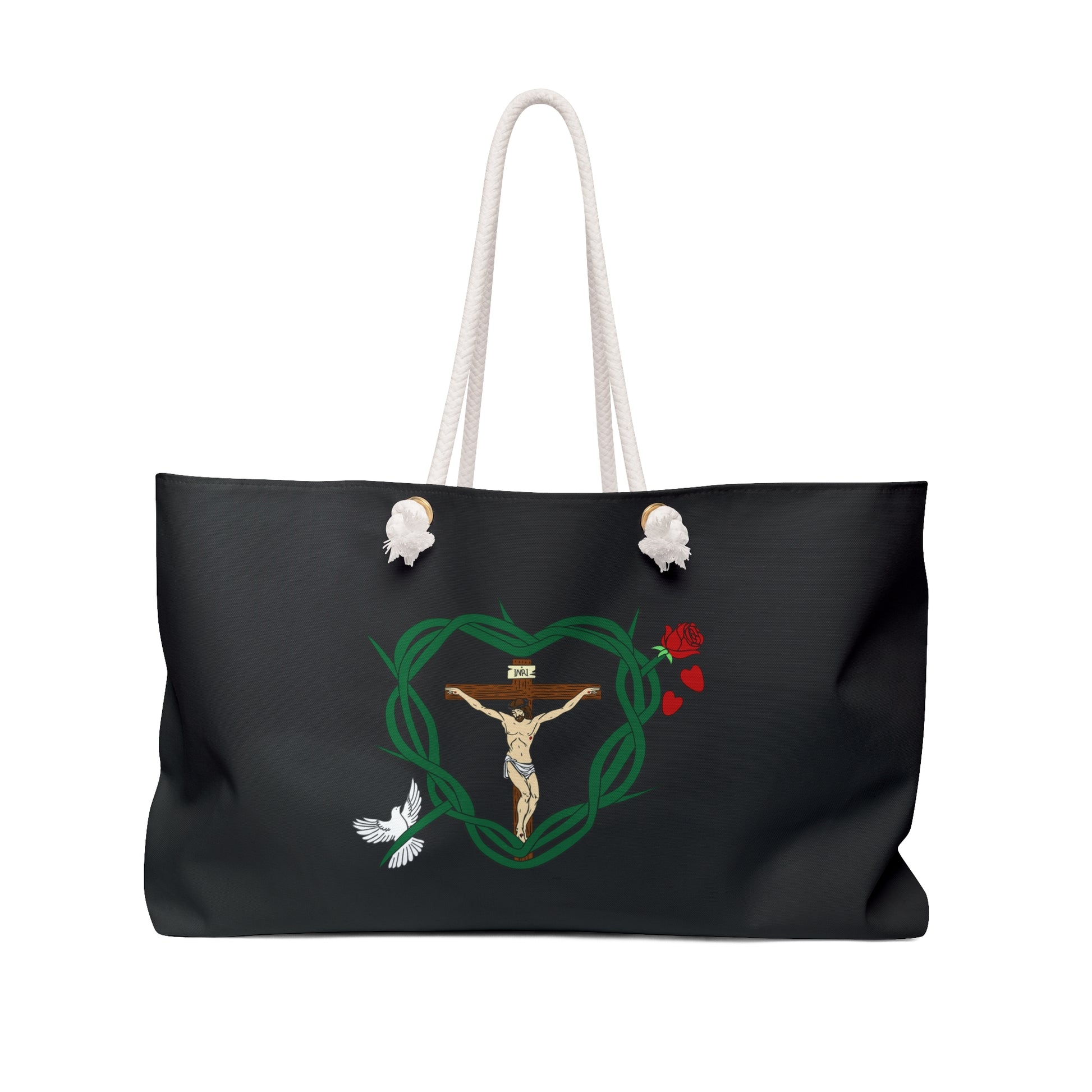 Featured in the design includes Jesus and His Cross and His Crown of Thorns. The Holy Spirit is represented by the bird. Our Blessed Virgin Mary is represented by the rose. The Blood of Christ is represented by the falling rose pedals.