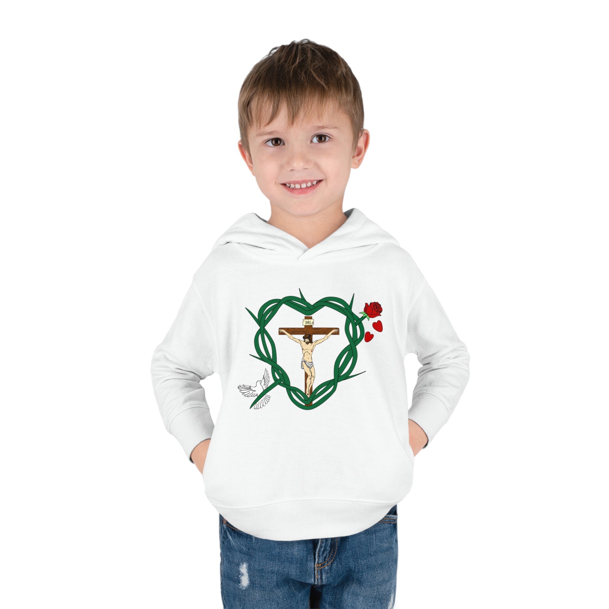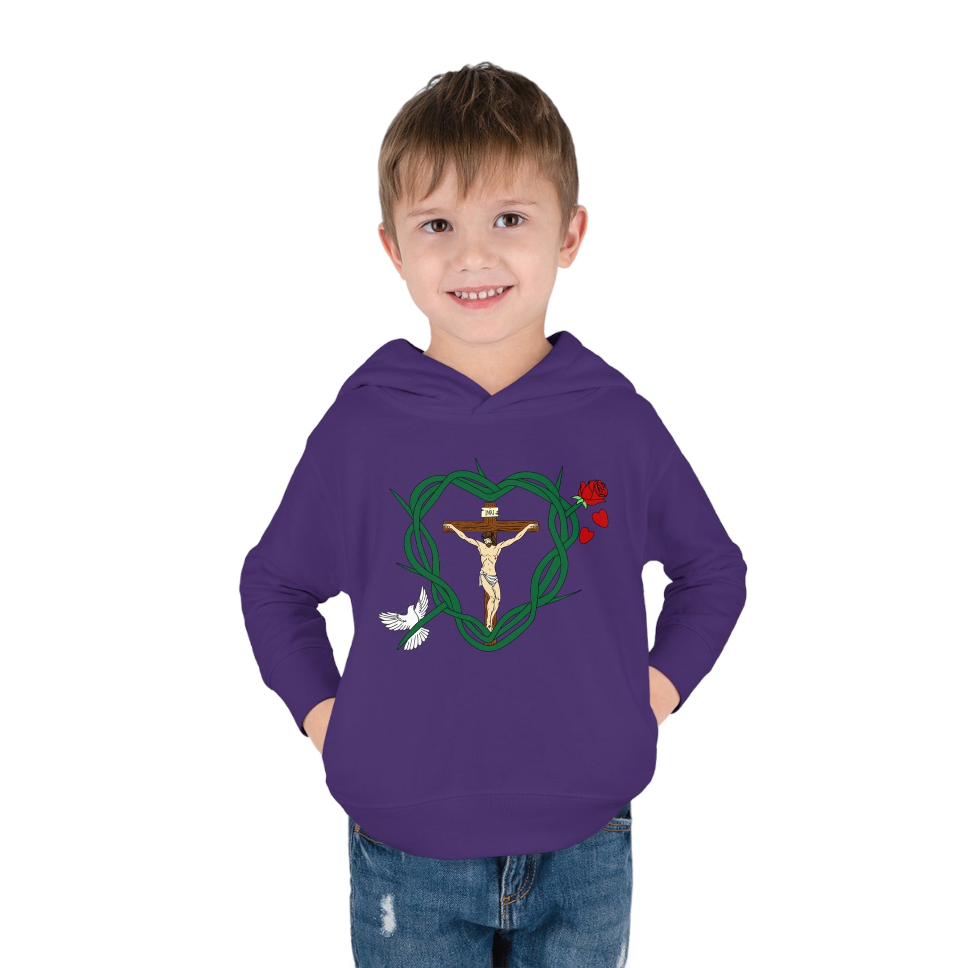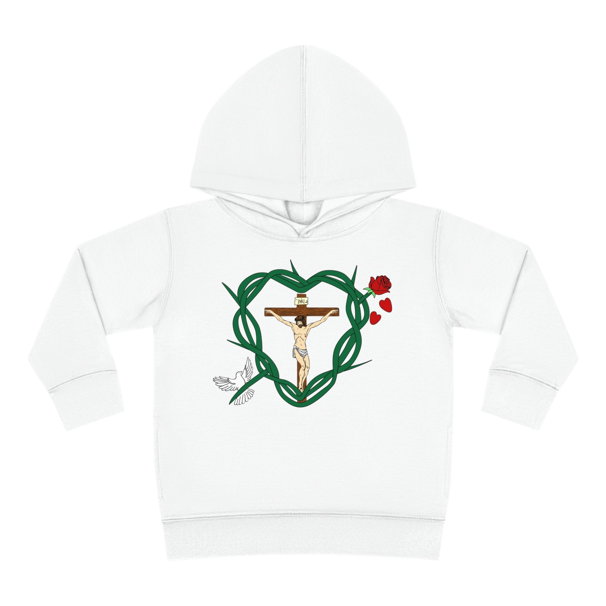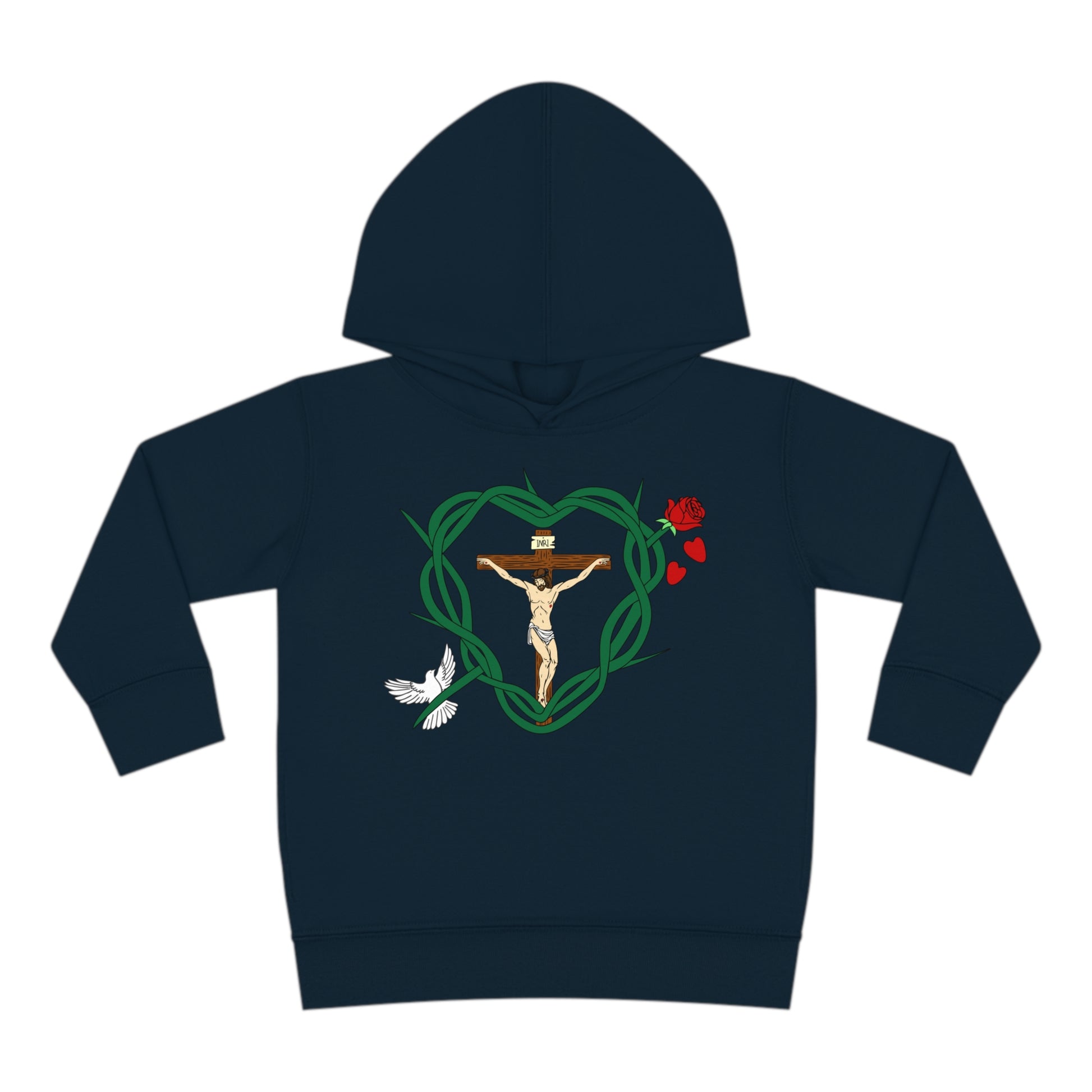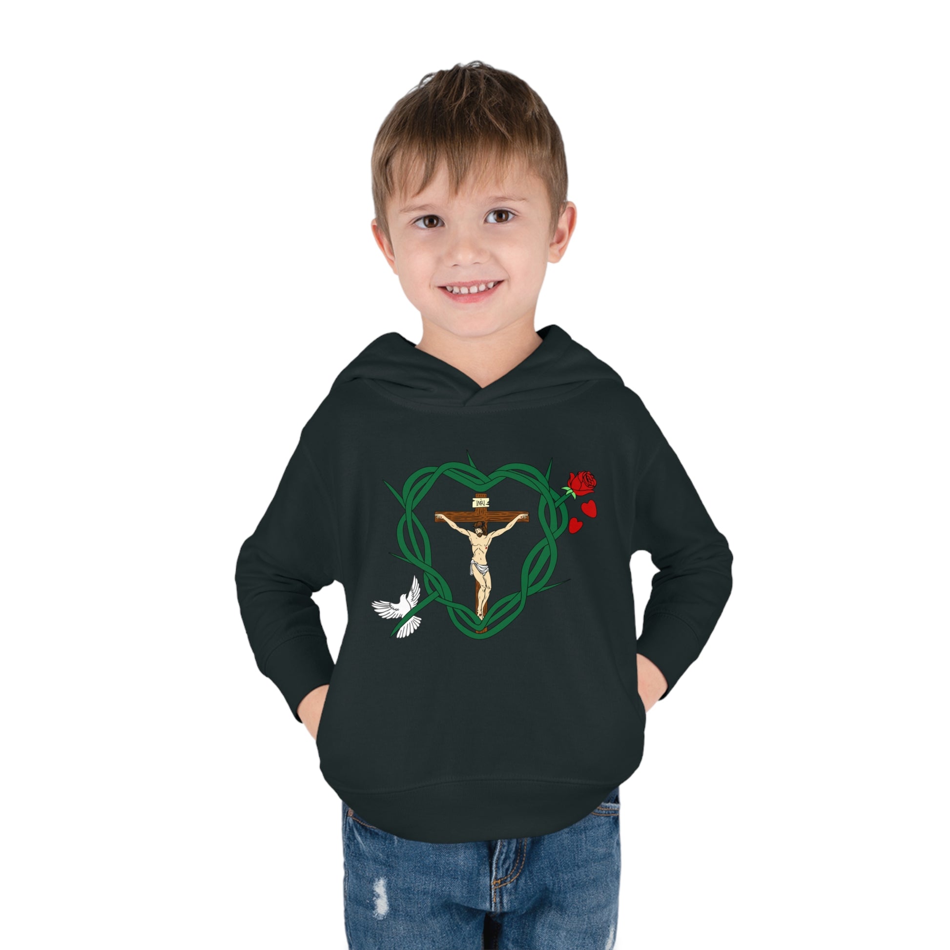 Featured in the design includes Jesus and His Cross and His Crown of Thorns. The Holy Spirit is represented by the bird. Our Blessed Virgin Mary is represented by the rose. The Blood of Christ is represented by the falling rose pedals.