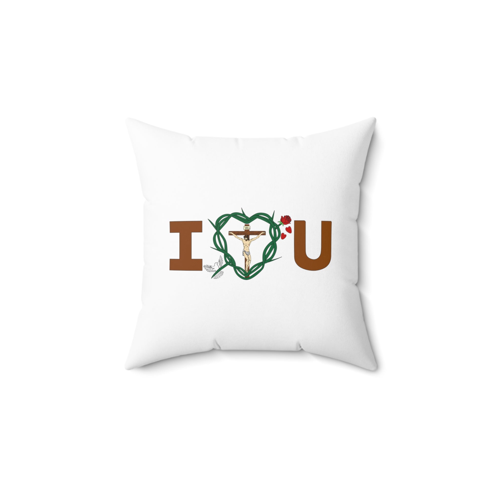Featured in the design include, God the Father is represented by the I, Jesus Christ, the cross and His crown of thorns shaped as a heart, The Holy Spirit is represented by the bird. The Virgin Mary is represented by the rose, The Blood of Christ is represented falling rose peddles, You and all of God's children is represented by the U.