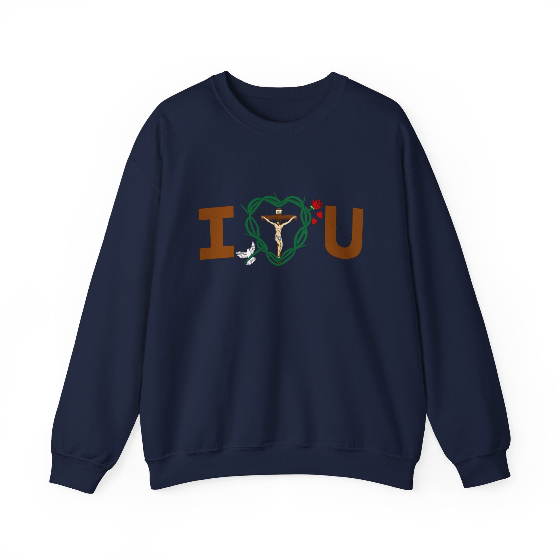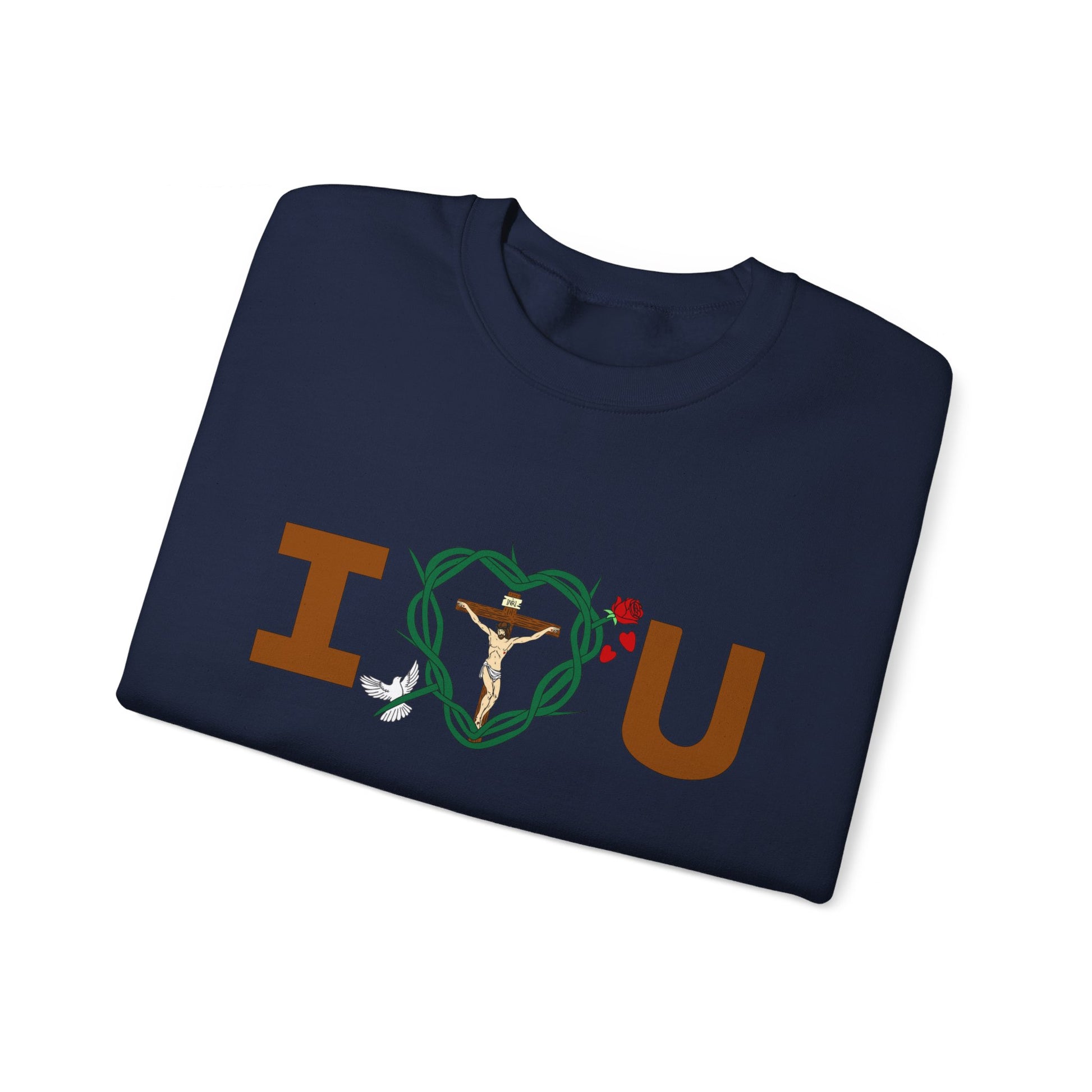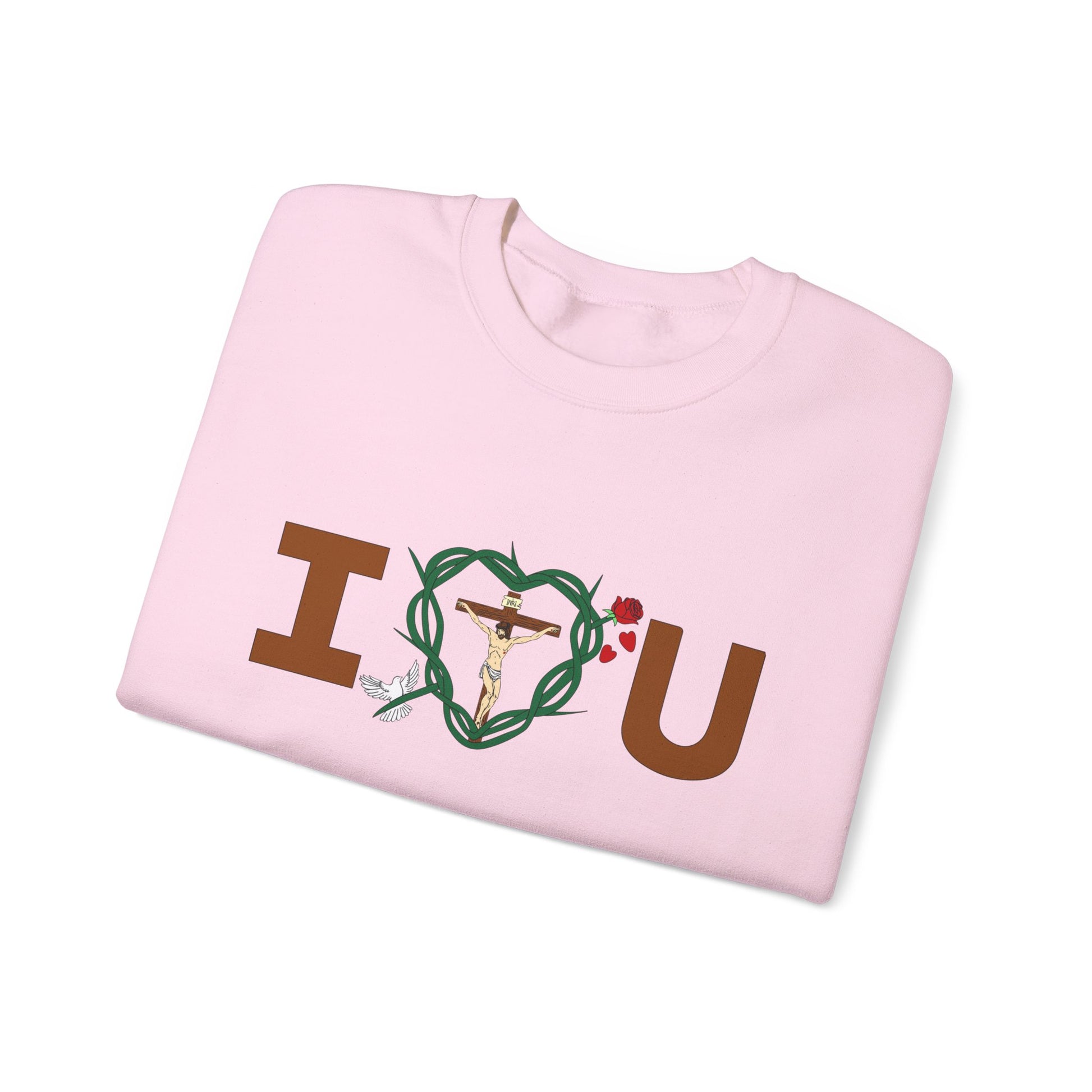 Featured in the design include, God the Father is represented by the I, Jesus Christ, the cross and His crown of thorns shaped as a heart, The Holy Spirit is represented by the bird. The Virgin Mary is represented by the rose, The Blood of Christ is represented falling rose peddles, You and all of God's children is represented by the U.