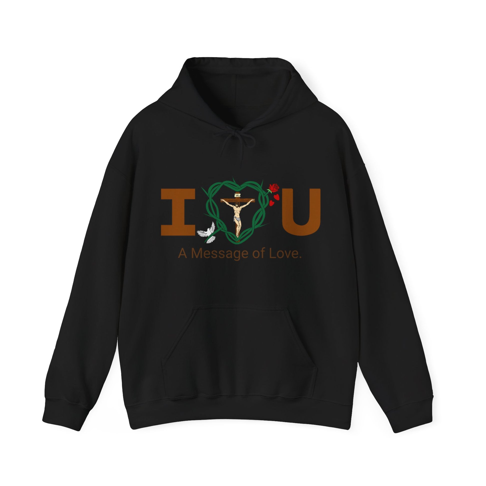 Embrace and feel loved and in sharing God's message of love for all in this warm and compfy hooded sweatshirt.