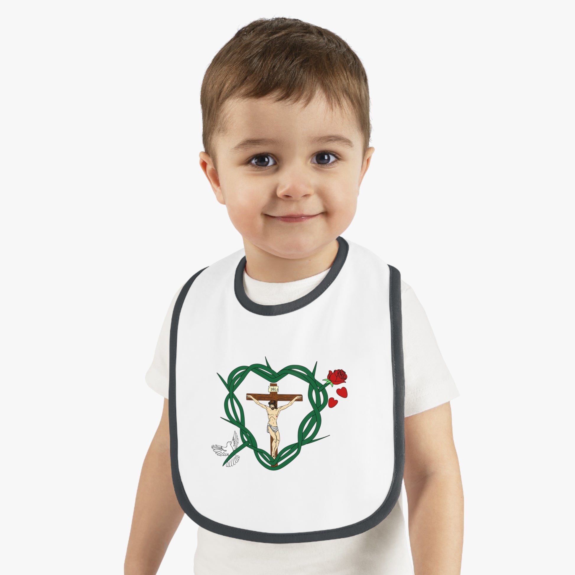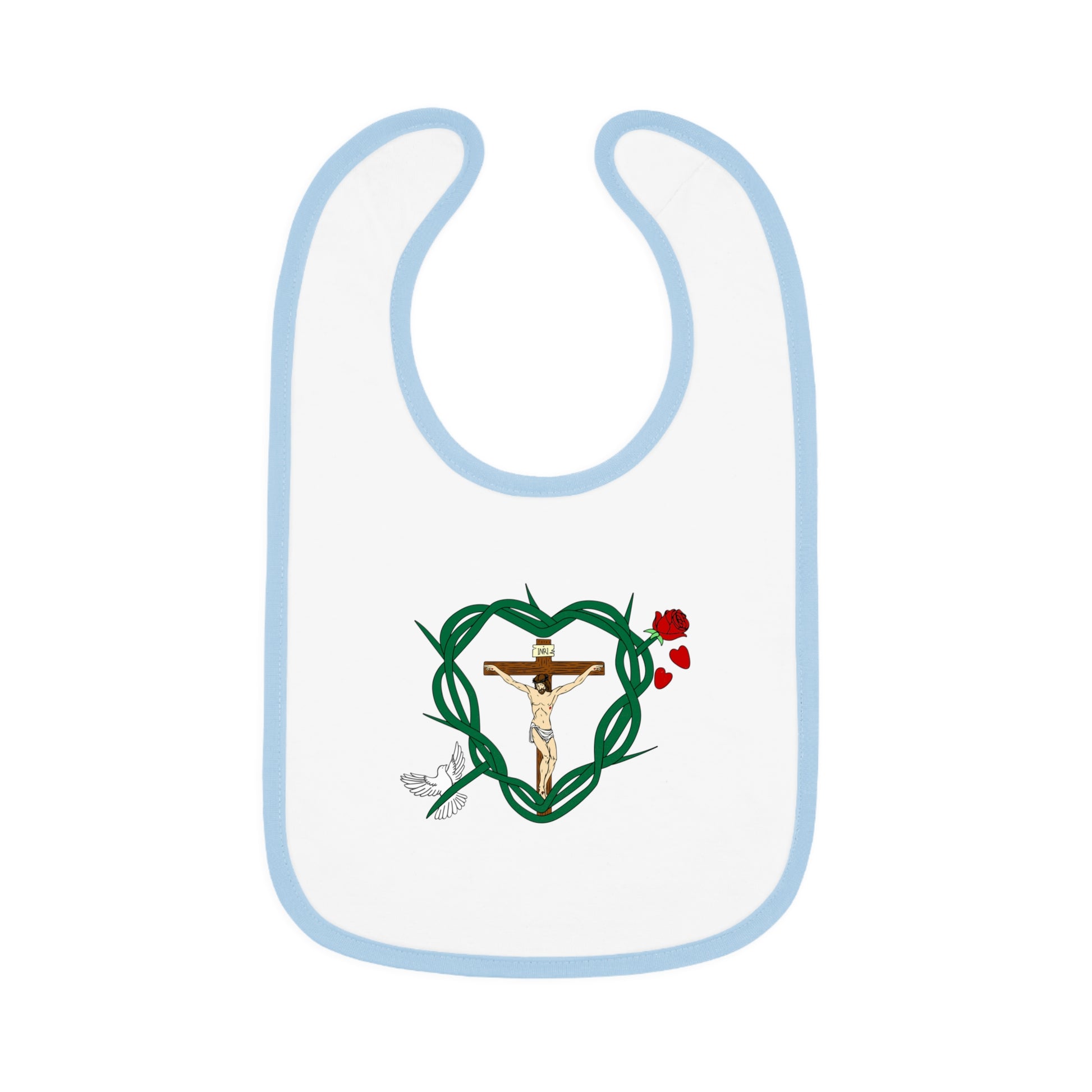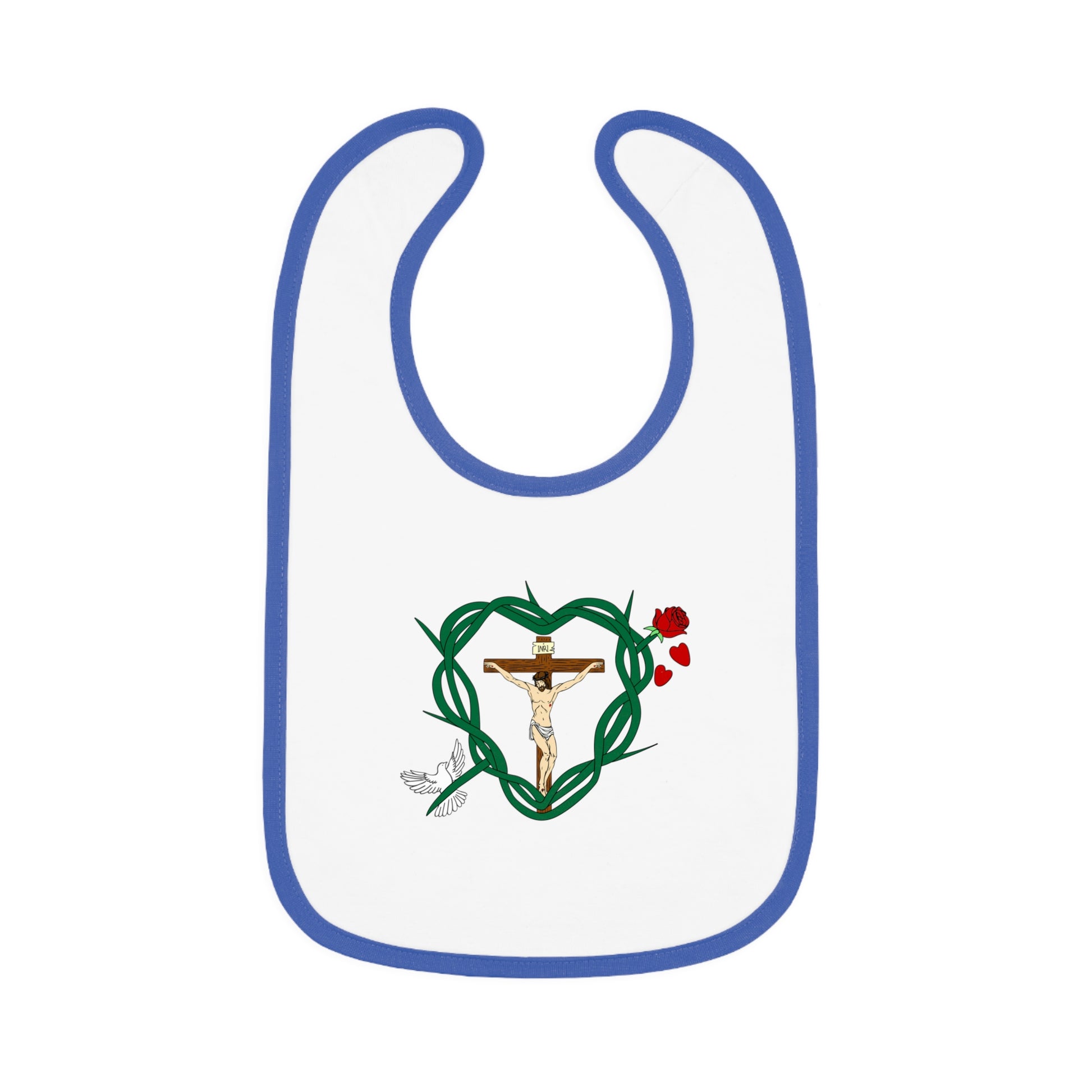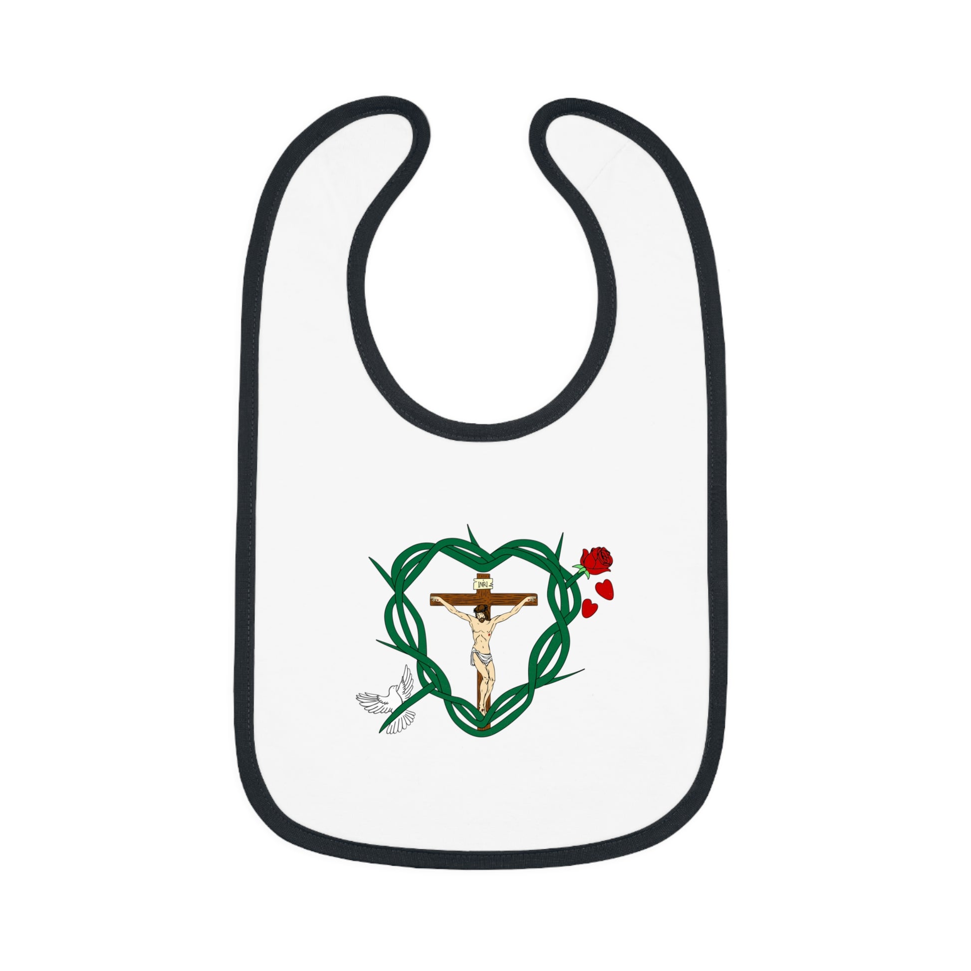 Featured in the design includes Jesus and His Cross and His Crown of Thorns. The Holy Spirit is represented by the bird. Our Blessed Virgin Mary is represented by the rose. The Blood of Christ is represented by the falling rose pedals.