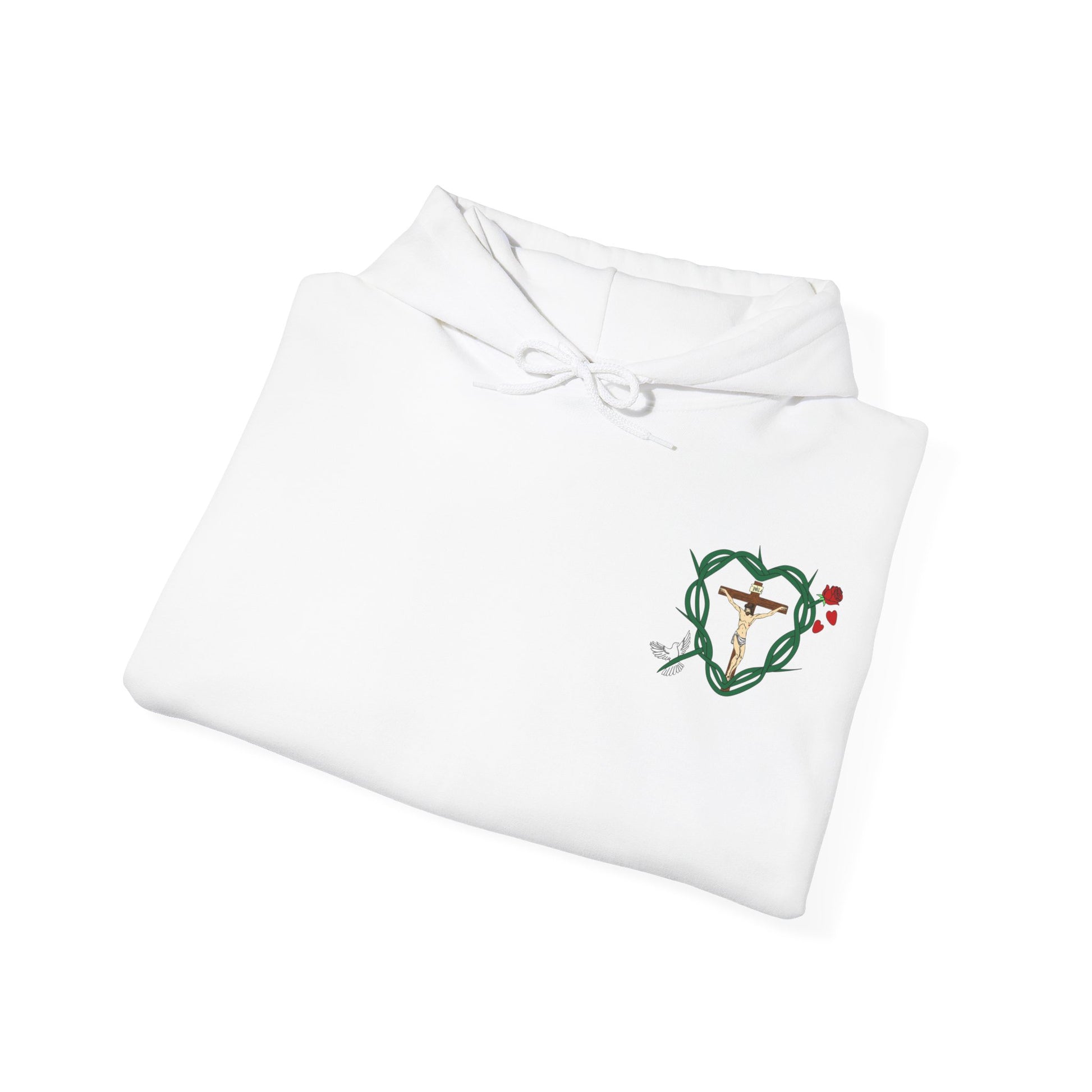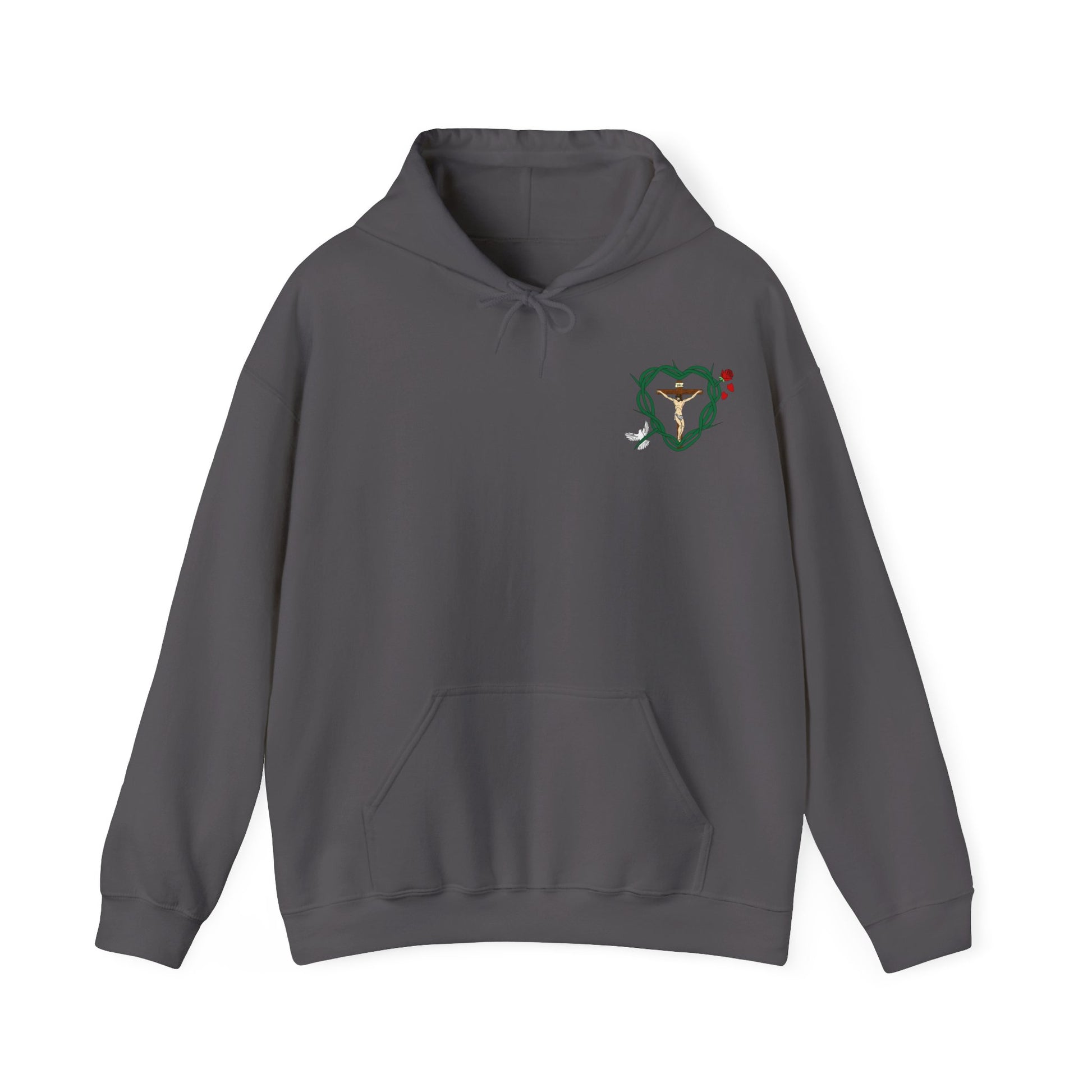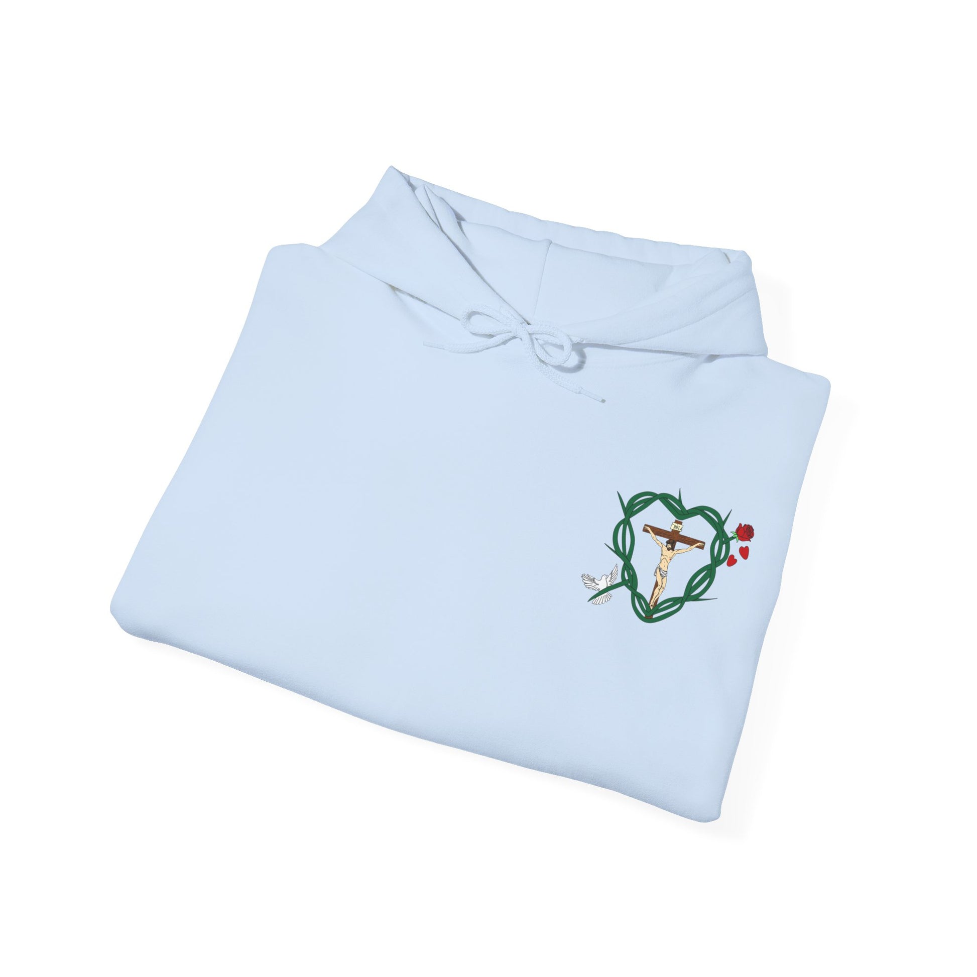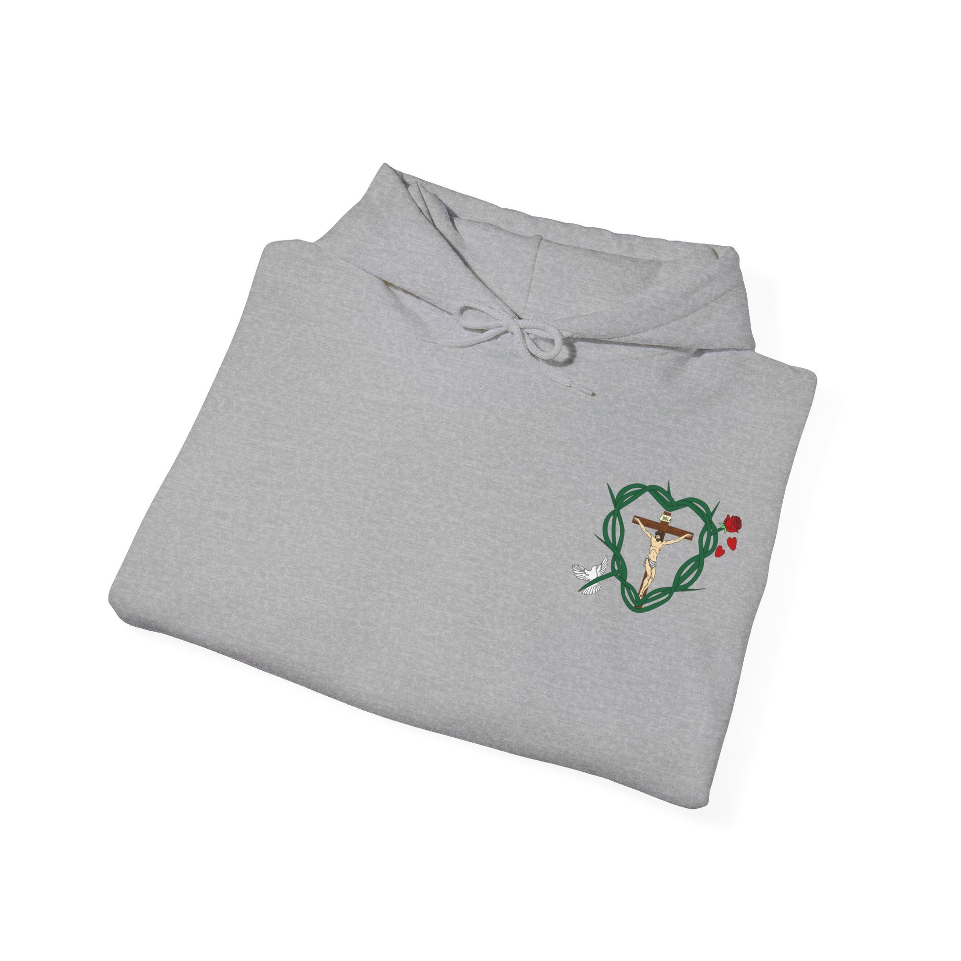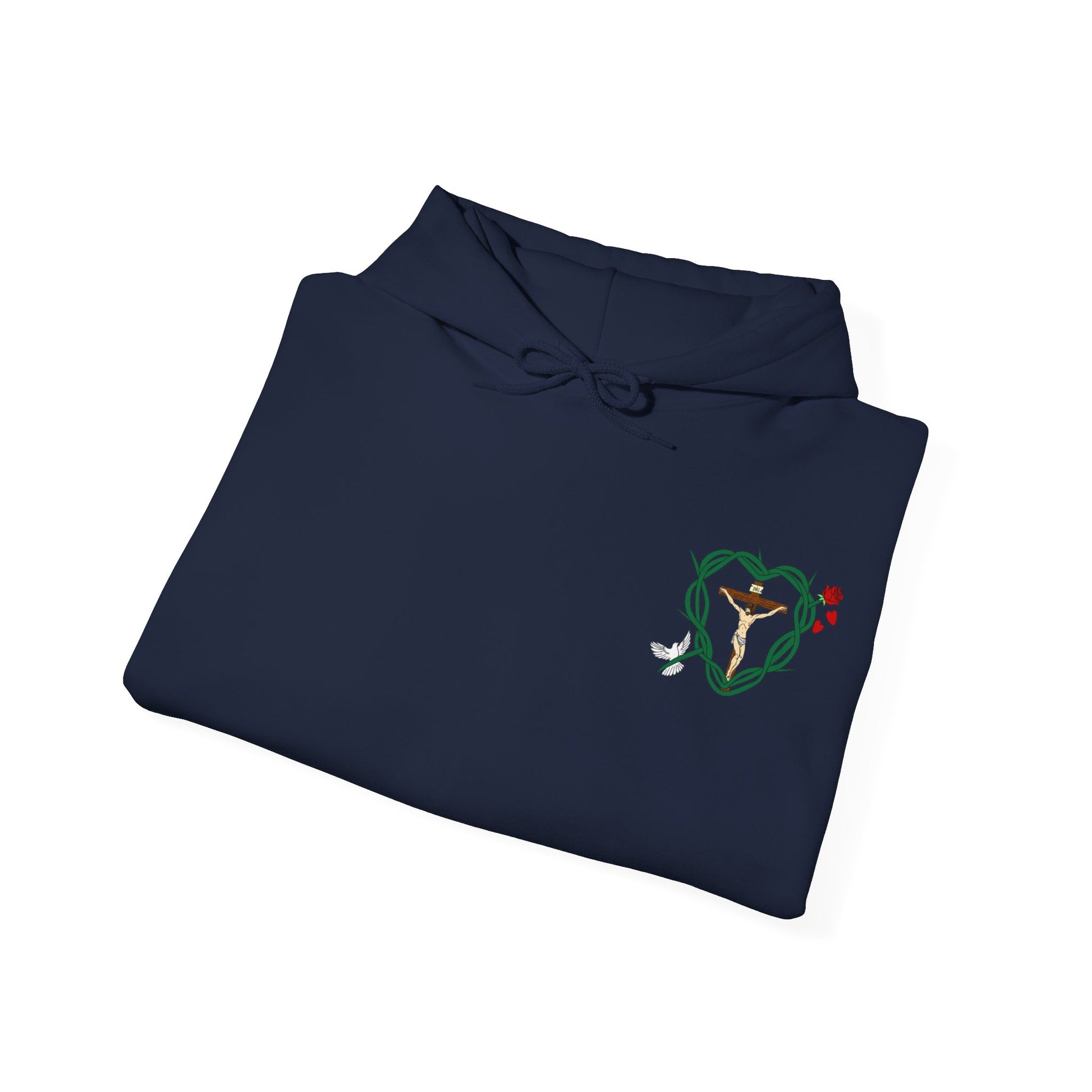 Featured in the design includes Jesus and His Cross and His Crown of Thorns. The Holy Spirit is represented by the bird. Our Blessed Virgin Mary is represented by the rose. The Blood of Christ is represented by the falling rose pedals.