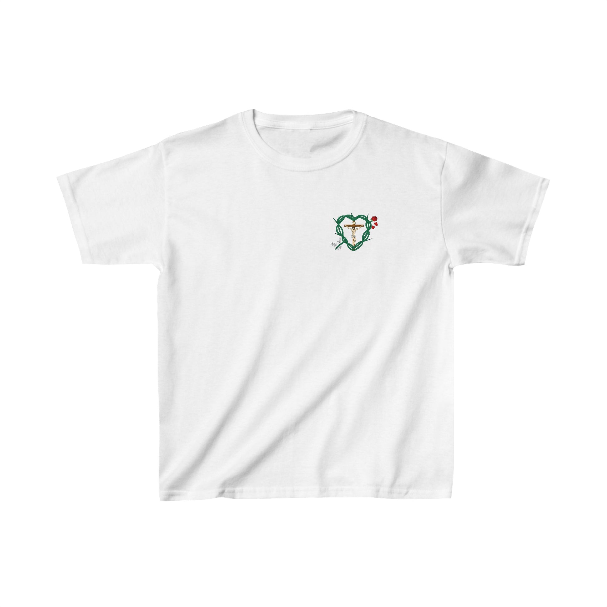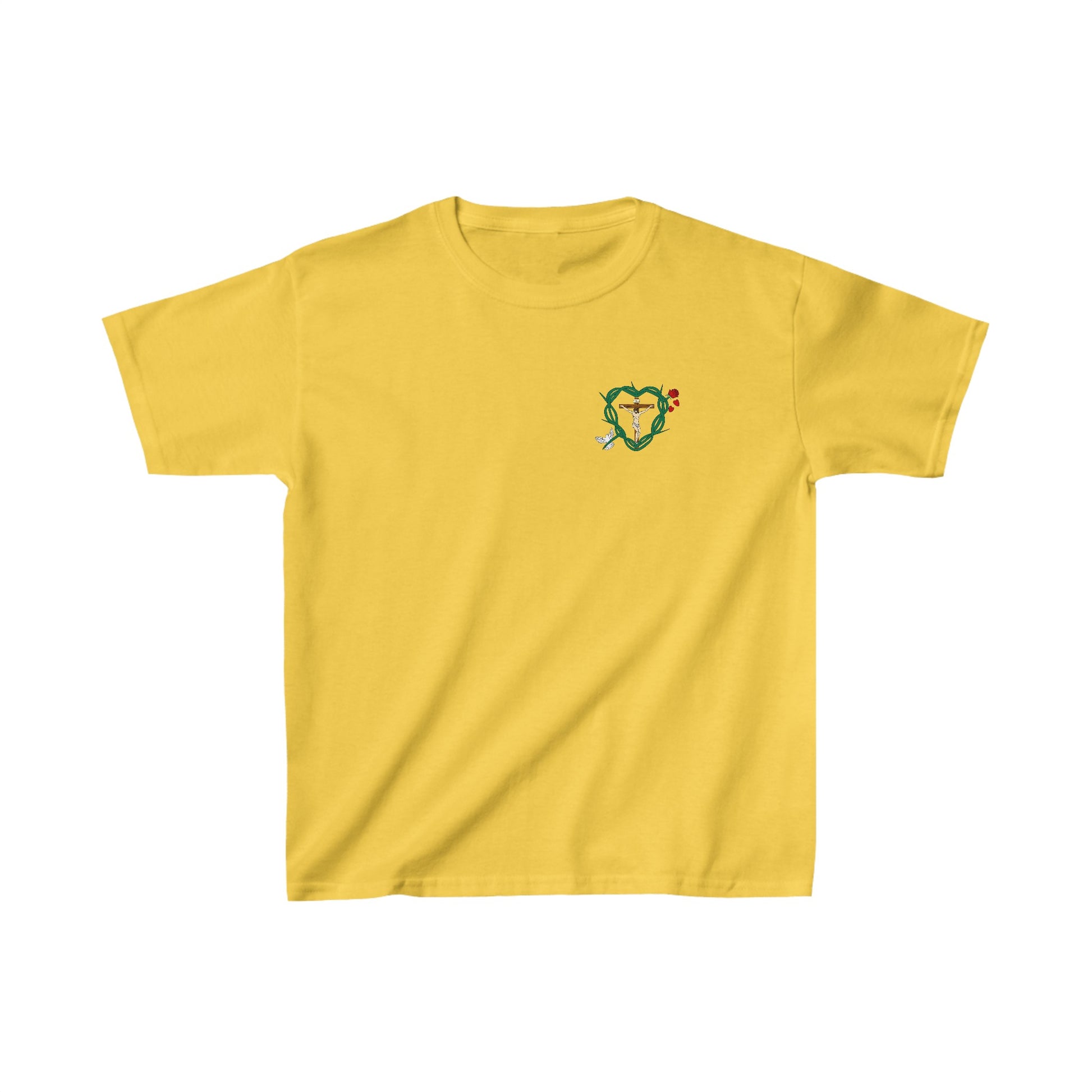 The kids heavy cotton tee is perfect for everyday use. The fabric is 100% cotton for solid colors. Polyester is included for heather-color variants. The shoulders have twill tape for improved durability. The collar is curl resistant due to ribbed knitting. There are no seams along the sides.