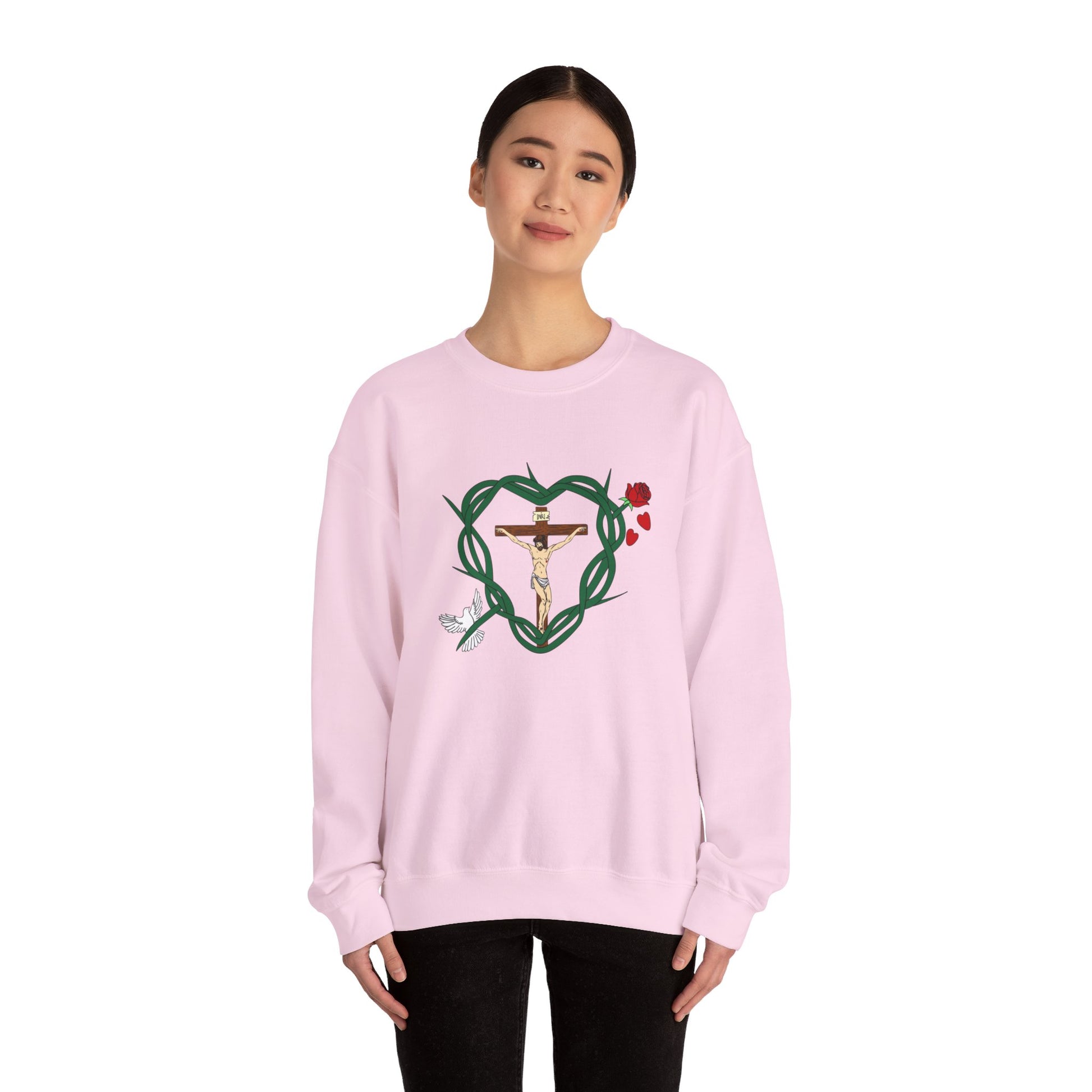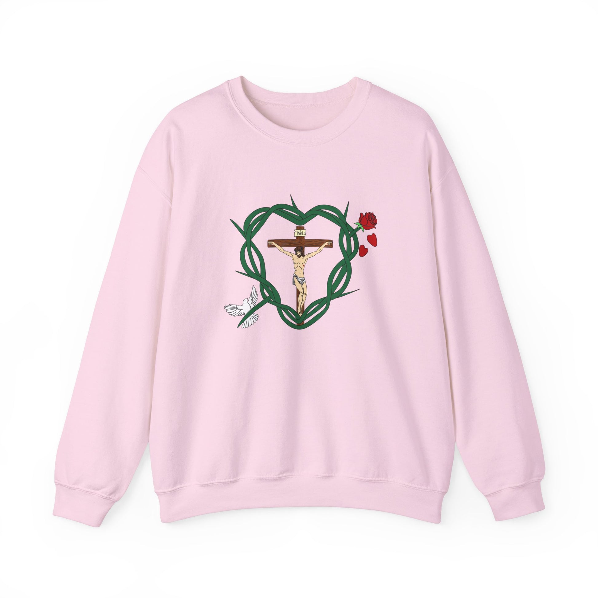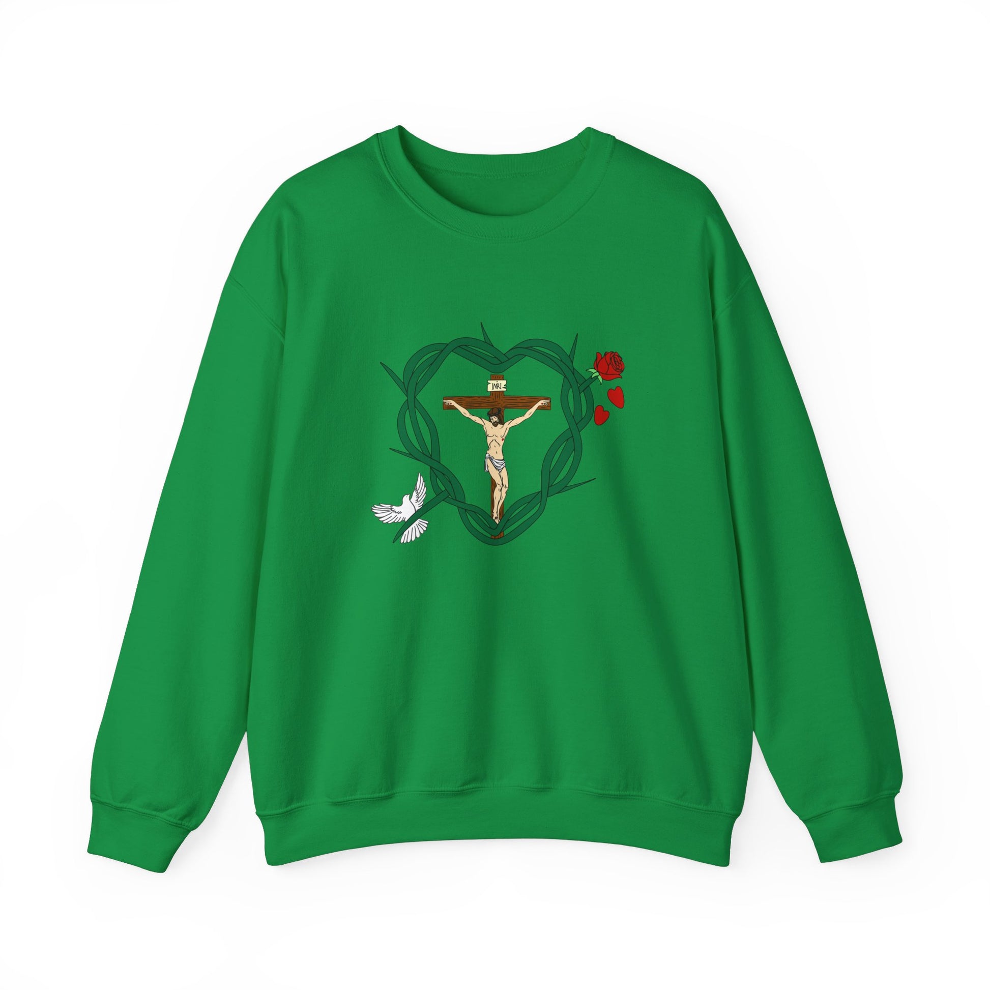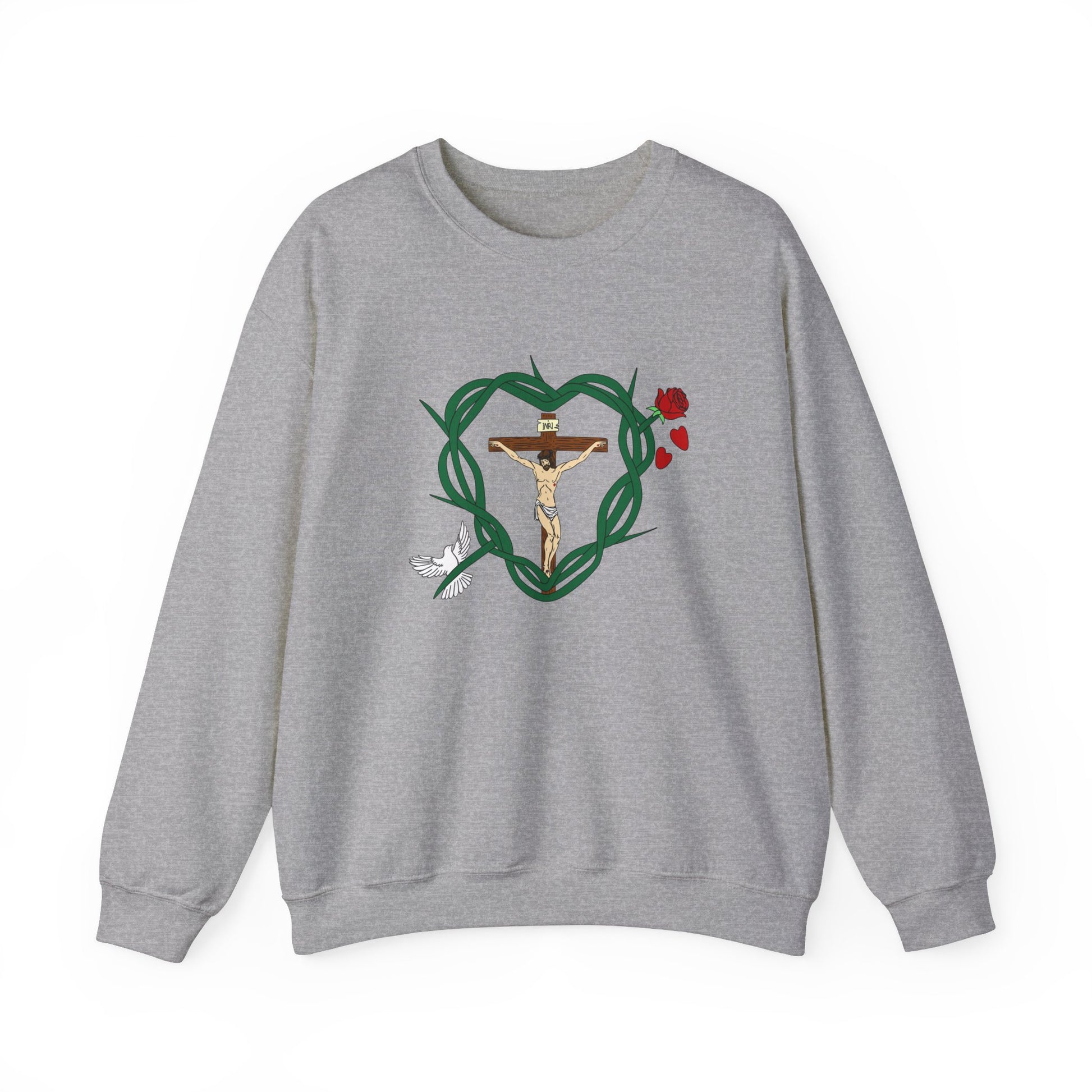 Featured in the design includes Jesus and His Cross and His Crown of Thorns. The Holy Spirit is represented by the bird. Our Blessed Virgin Mary is represented by the rose. The Blood of Christ is represented by the falling rose pedals.