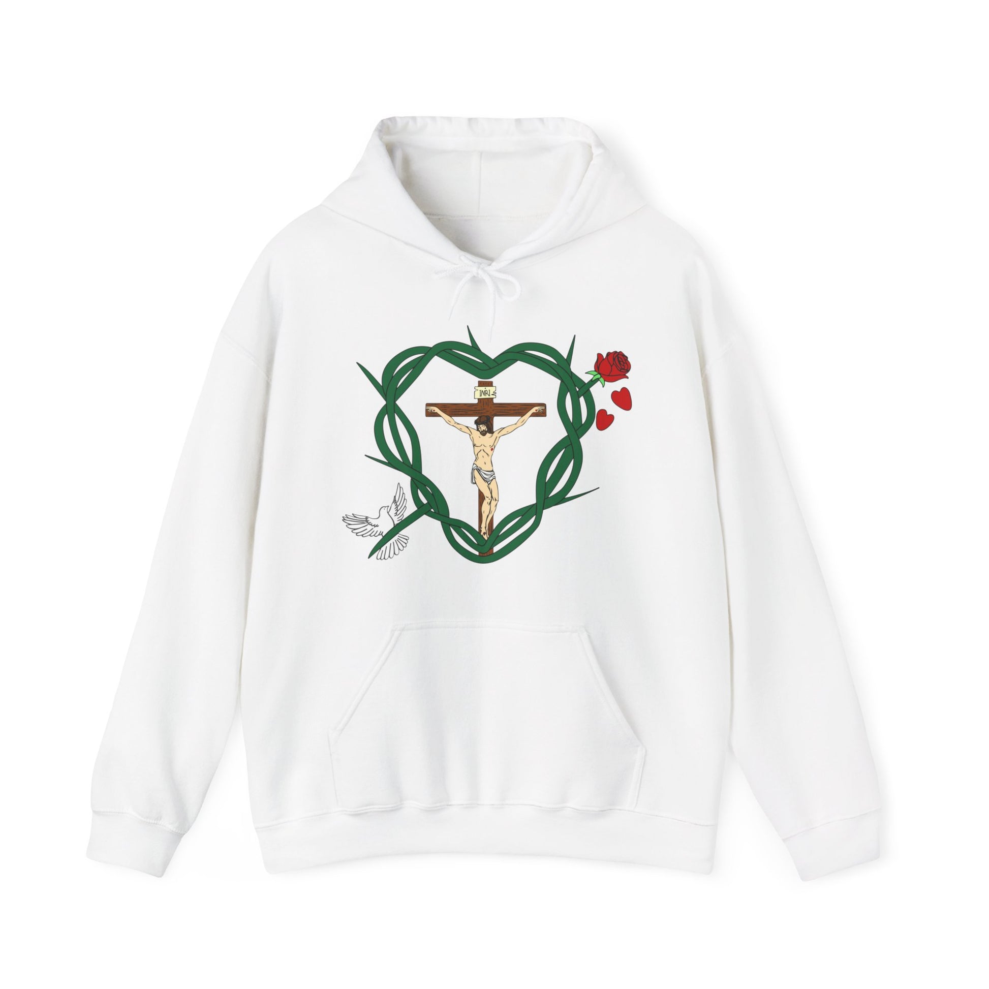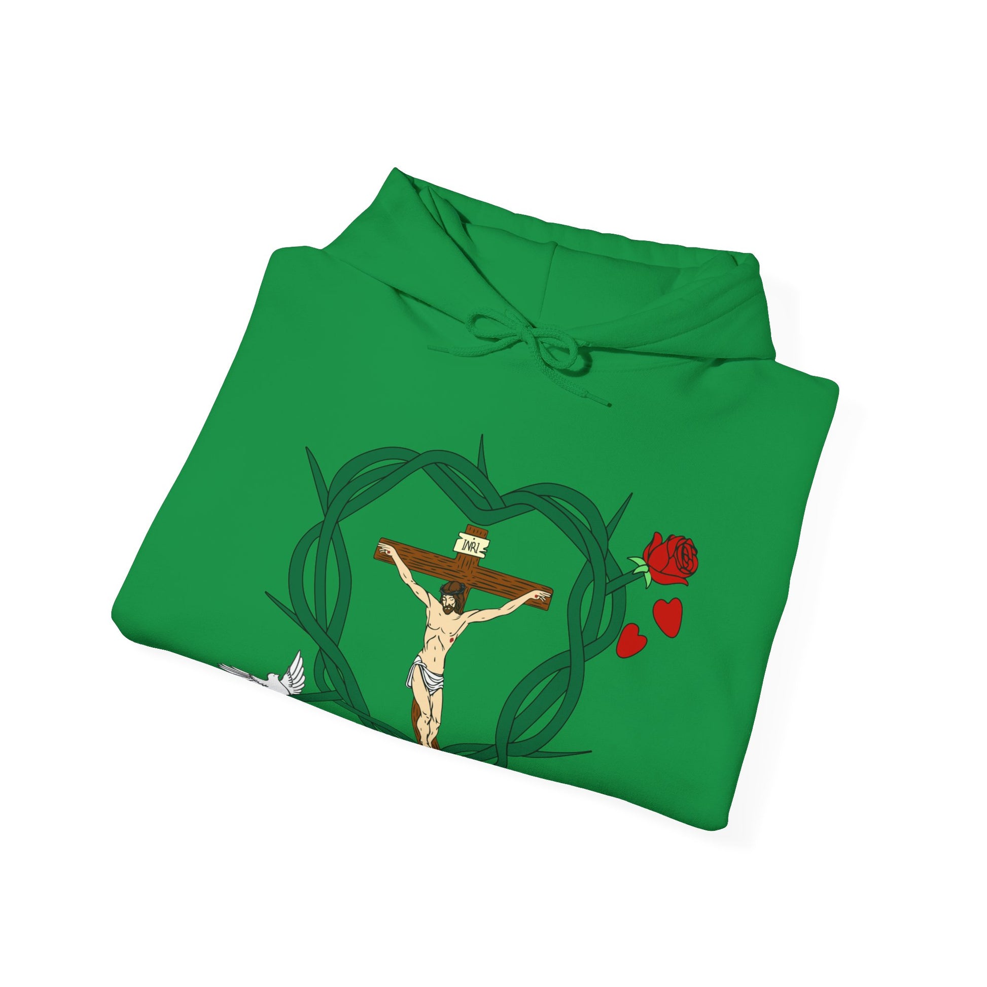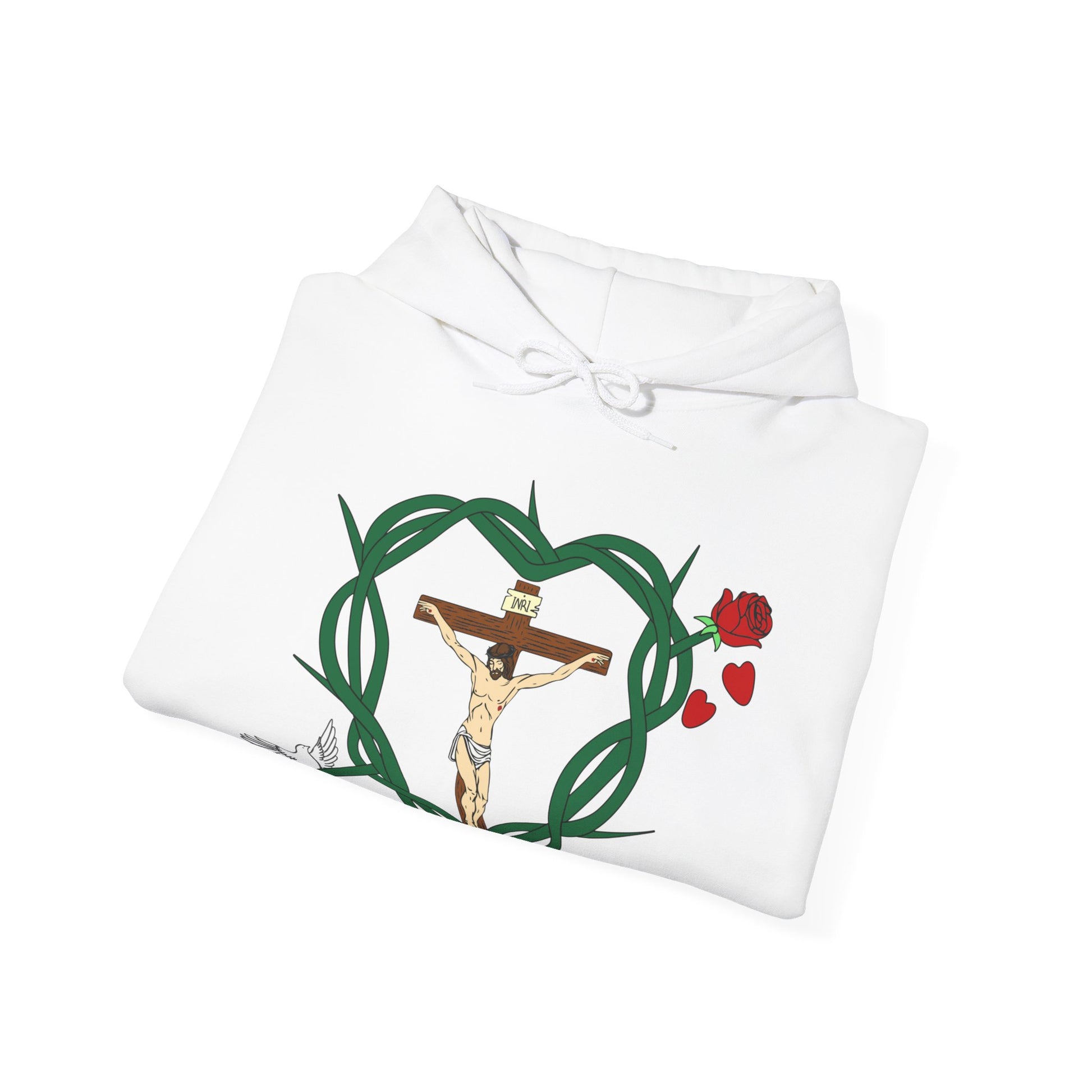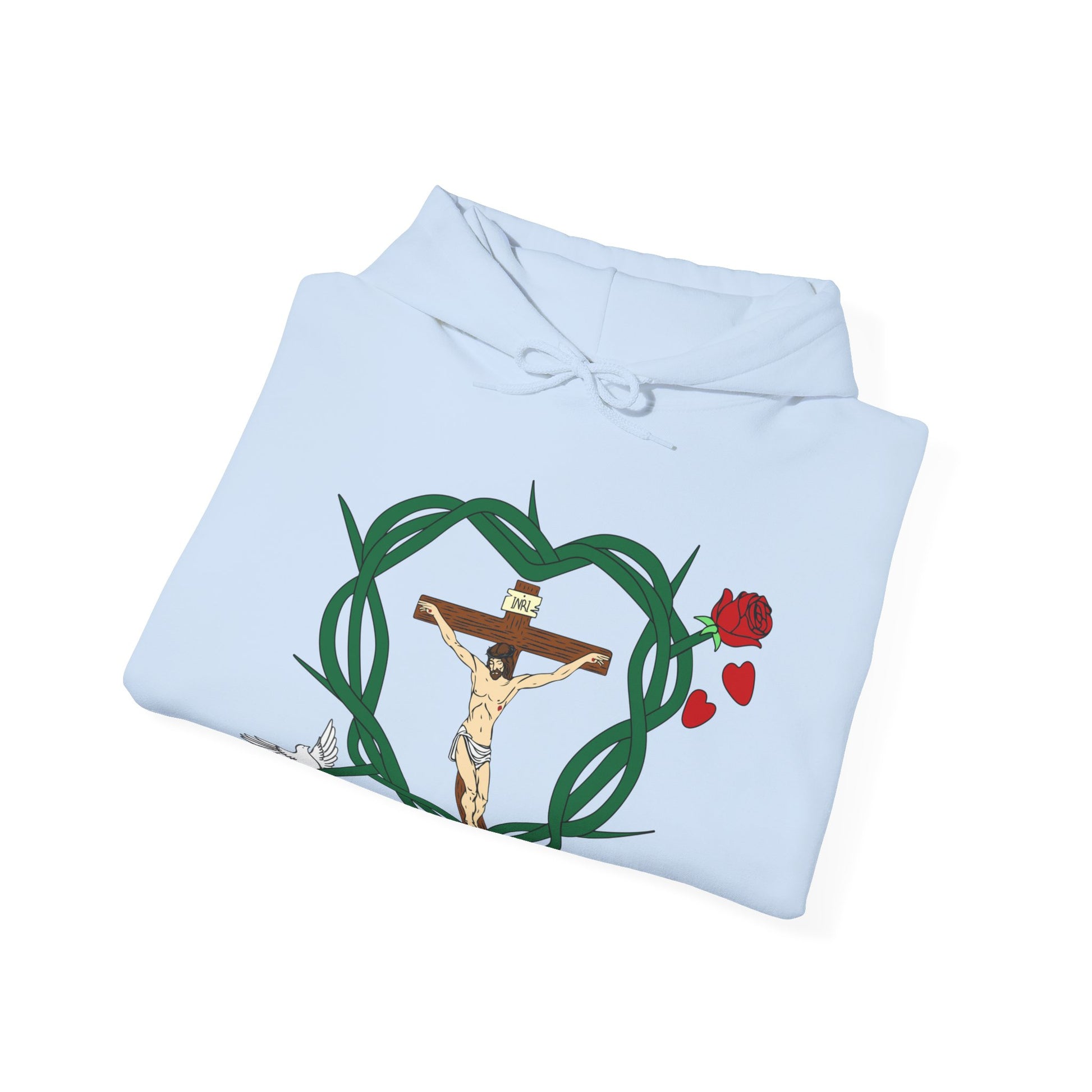 Featured in the design includes Jesus and His Cross and His Crown of Thorns. The Holy Spirit is represented by the bird. Our Blessed Virgin Mary is represented by the rose. The Blood of Christ is represented by the falling rose pedals.